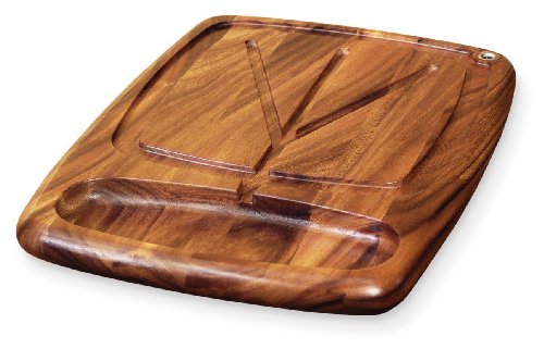 Presentation carving board slopes to the right so the excess juices are collected in the pool where you can place your slices to keep them moist This beautifully designed board is made from Acacia wood that is farmed throughout Southeast Asia This pod bearing tree is known for its rich dark colo